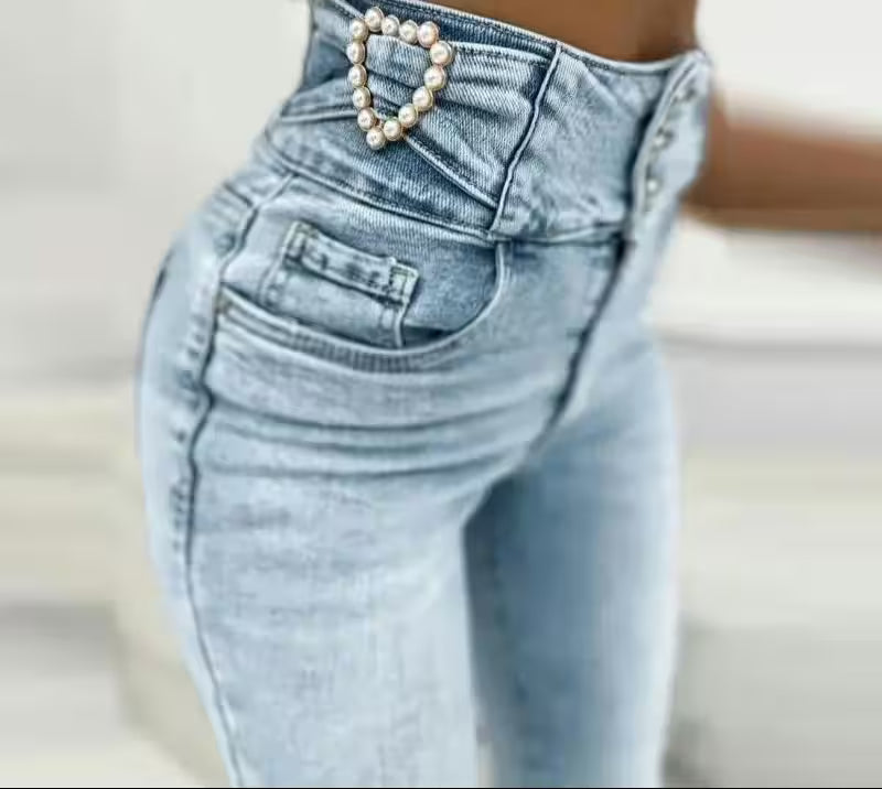 Step into style with high-waisted, skinny-fit pencil jeans, featuring a slight stretch, beading details, and a distressed wash for a perfect blend of casual elegance and modern flair.