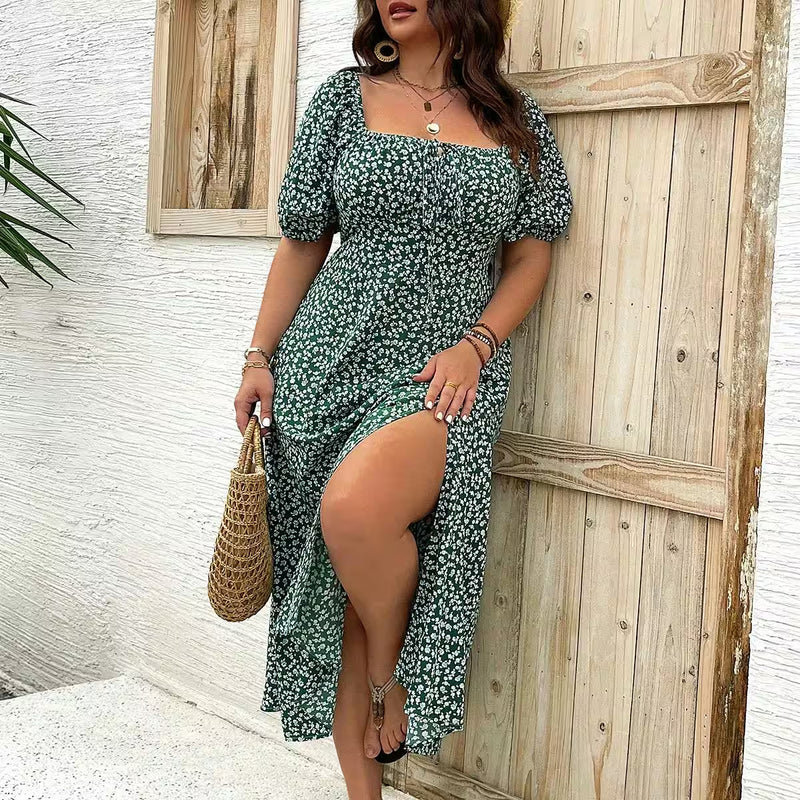 Introducing our Plus Size Ditsy Floral / All Over Print Split Dress — a stunning blend of elegance, comfort, and bold femininity.