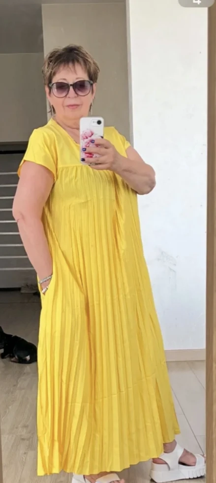Great summer dress. Good quality semi-thick synthetic fabric, pleasant to the touch. No protruding threads, smooth seams.