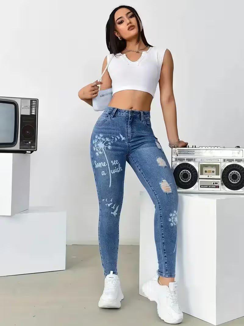 Stretch Trousers Slim Fit Jeans Print Flower Casual Fashion –
